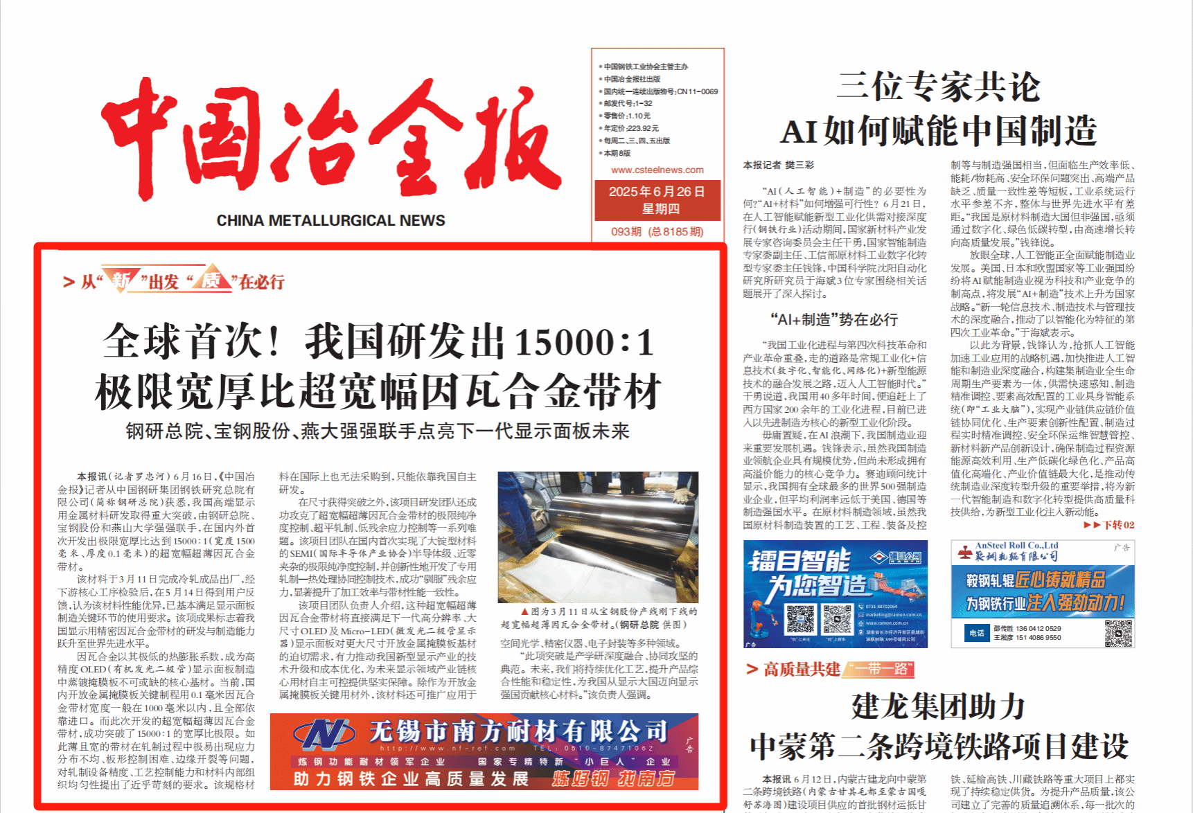 该因瓦钢产品为米兰·体育_米兰(中国)联合中国钢研集团、宝山钢铁股份有限公司共同研发的全球首款15000:1极限宽厚比(0.1mm×1500mm)超薄因瓦合金带材,经下游企业量产验证,产品性能全面达到国际领先水平。